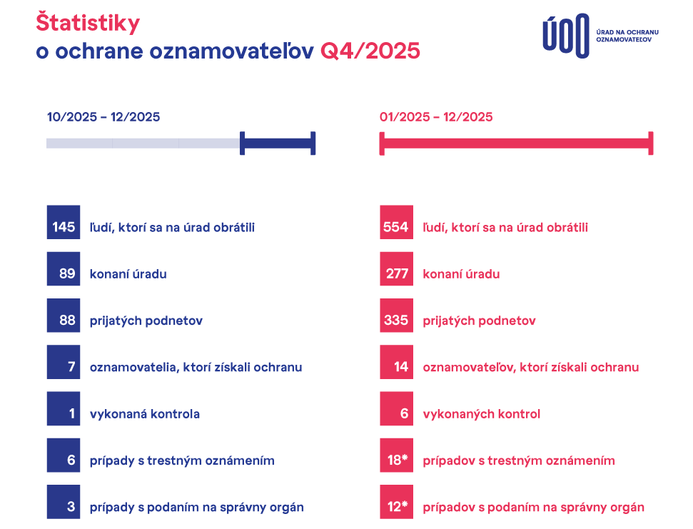 V porovnaní s predchádzajúcimi štvrťrokmi vzrástol aj počet oznamovateľov, ktorí získali ochranu. V období október až december bola ochrana priznaná šiestim osobám. Úrad zároveň pokračoval v kontrolnej činnosti a riešil aj prípady súvisiace s podaním trestného oznámenia či podnetu na správny orgán.