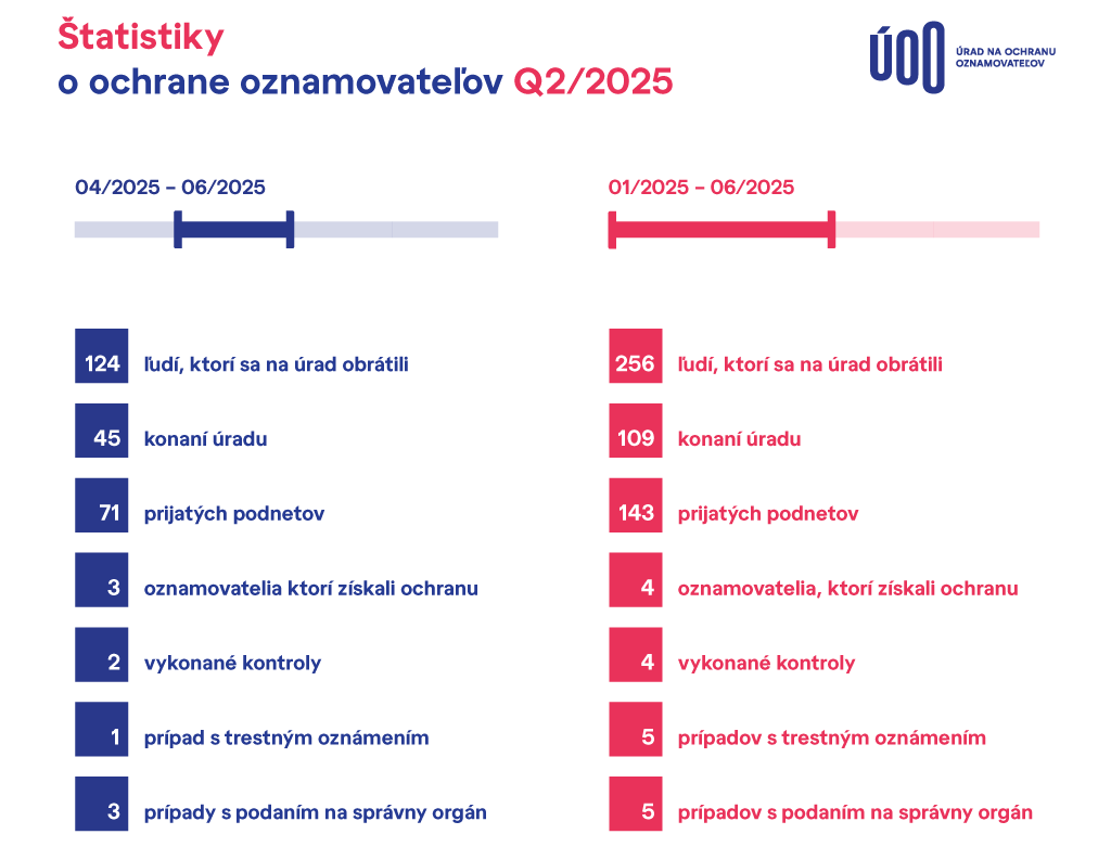 Druhý štvrťrok potvrdil trend zo začiatku roka a Úrad na ochranu oznamovateľov tak zaznamenal za prvý polrok 2025 výrazný nárast počtu prijatých podnetov. Oproti predchádzajúcim rokom ide o rekordné číslo – od januára do júna ÚOO prijal celkovo 143 podnetov.